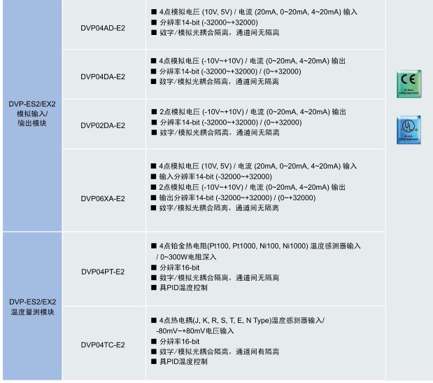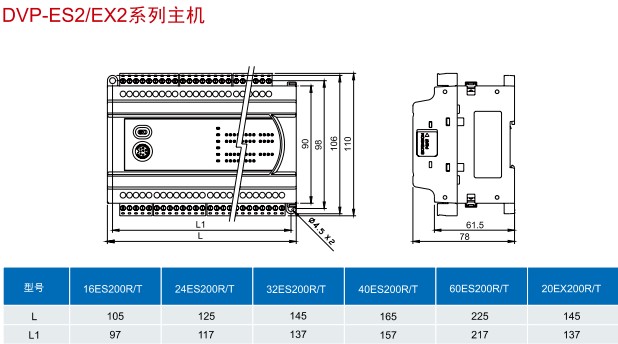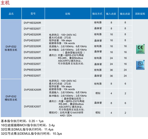 | DVP32ES200T | 32点主机,16DI/16DO(NPN/24Vdc/0.5A), 2路100K输入/输出,2路20K输入/输出, AC电源 |