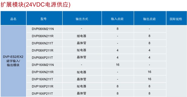 | DVP32ES211T | 32点主机,16DI/16DO(NPN/24Vdc/0.5A),2路100K输入/输出,2路20K输入/输出, DC电源 |