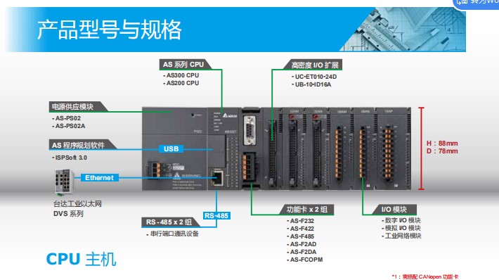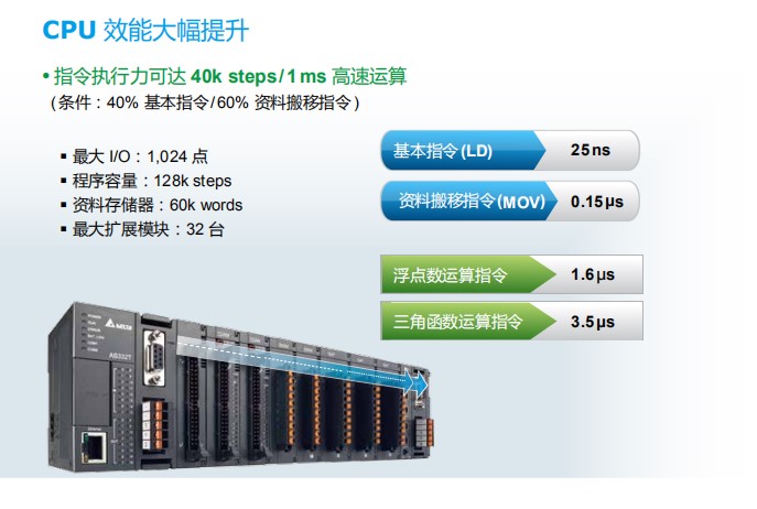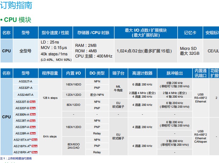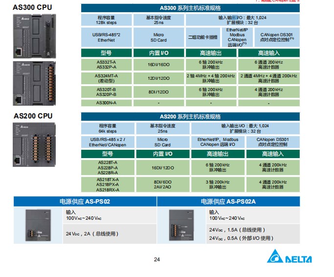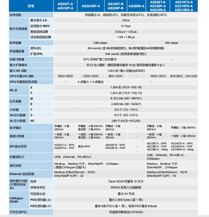 AS300 AS324MT-A 12DI, 12DO(NPN), 2组4M差动输入, 2轴4M差动输出, 4组200K AB相输入, 4轴200K AB相输出, 128K步容量, 以太网口, RS485x2, Micro SD卡, 及选配2个功能卡