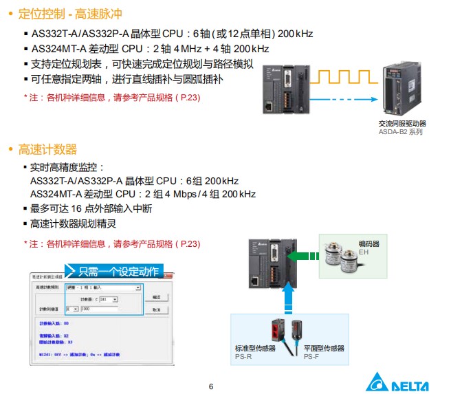 AS300 AS332P-A 16DI, 16DO(PNP), 6组200K AB相输入, 6轴200K AB相输出, 128K步容量, 内建以太网口, RS485x2, Micro SD卡, 以及可选配2个功能卡