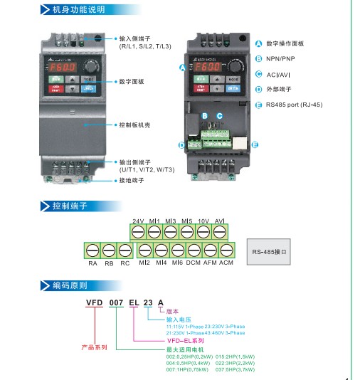VFD-EL VFD022EL43A 3P460V,2200W,无刹车单元,内置EMC滤波器