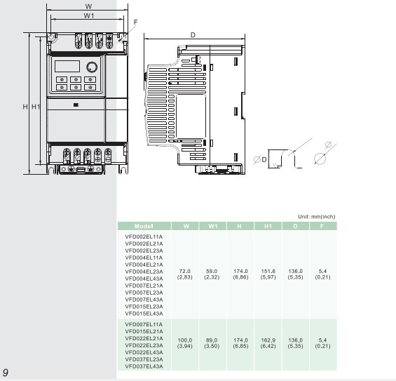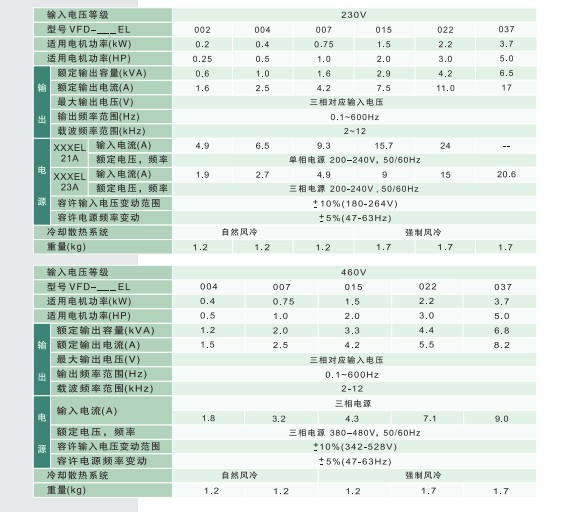 VFD-EL VFD022EL21A 1P230V,2200W,无刹车单元,内置EMC滤波器