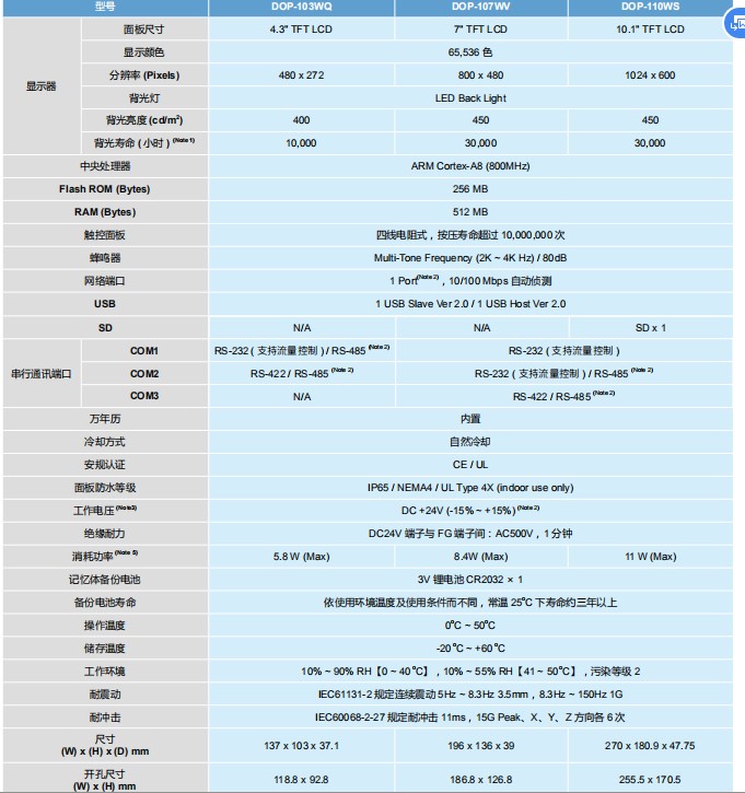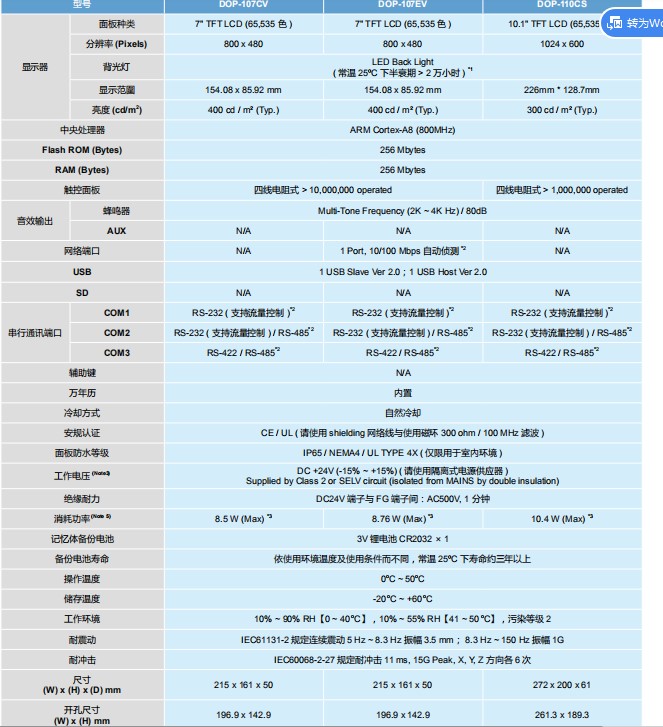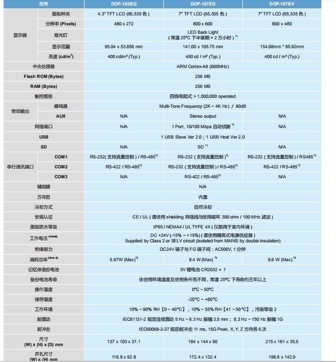 | HMI | DOP-107BV | 7"/分辨率800×480/U盘/打印机/鼠标,高亮度400cd/㎡,COM1:RS-232/485, COM2:RS-422/485,COM3:N/A |