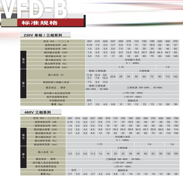 VFD-B VFD075B23A 220V/3P,7.5kW,刹车内建,DC电抗器选购IP20