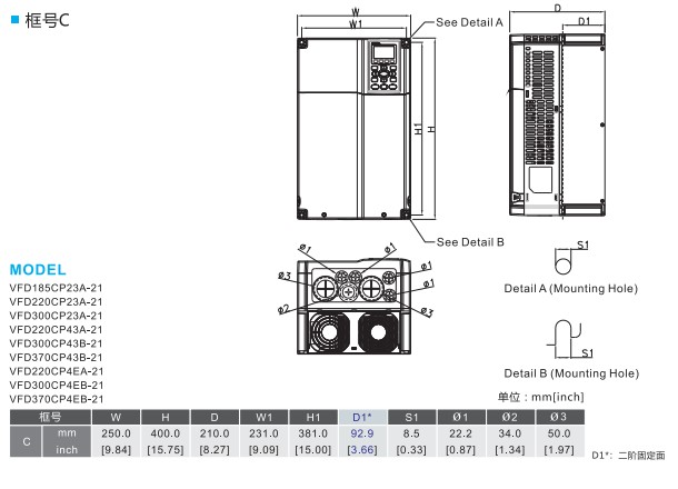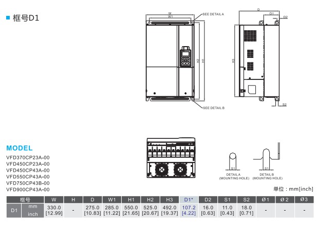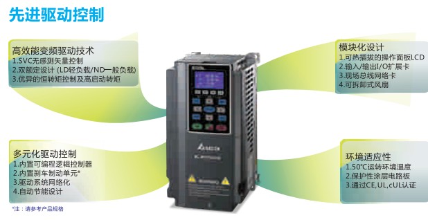 | VFD-CP | VFD900CP23A-00 | 220V/3P,90kW,内置10k PLC,刹车内建,DC电抗选购, UL,CE,IP00,UL OPEN TYPE |