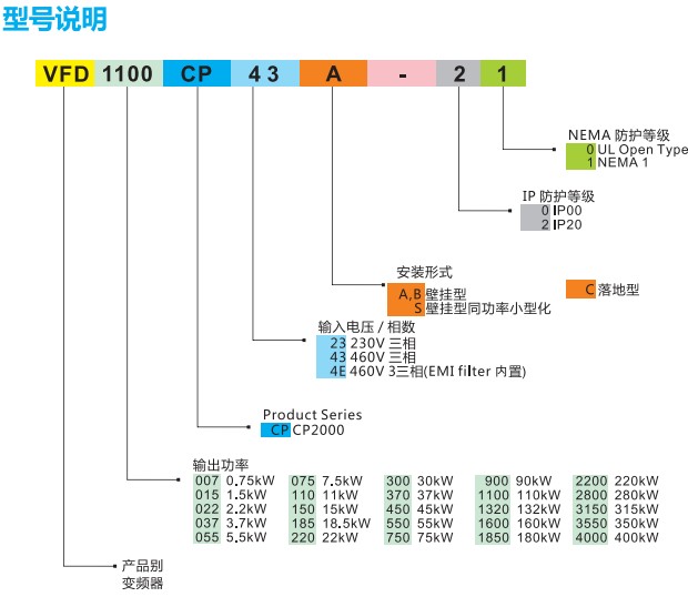 | VFD-CP | VFD1100CP43A-21 | 内380V/3P,110kW,置10k PLC,刹车选购,DC电抗内建, UL,CE,IP20,NEMA1 |