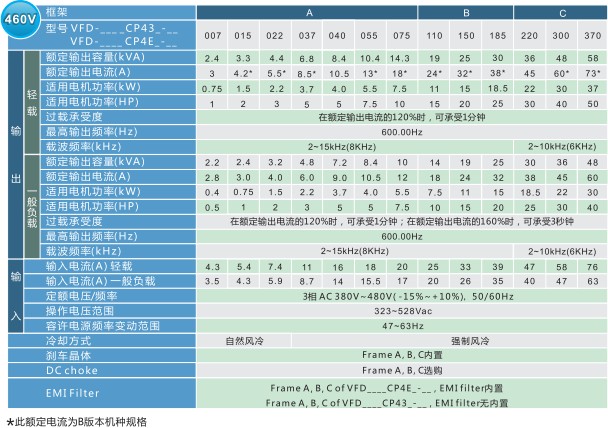 | VFD-CP | VFD037CP43B-21 | 380V/3P,3.7kW,内置10k PLC,刹车选购,DC电抗内建, UL,CE,IP20,NEMA1 |