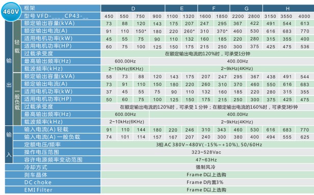 | VFD-CP | VFD450CP43A-21 | 380V/3P,45kW,内置10k PLC,刹车选购,DC电抗内建, UL,CE,IP20,NEMA1 |