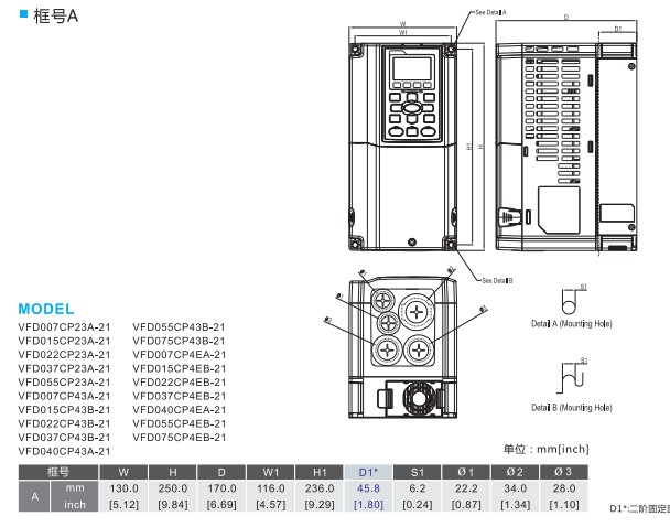 | VFD-CP | VFD750CP23A-00 | 220V/3P,75kW,内置10k PLC,刹车内建,DC电抗选购, UL,CE,IP00,UL OPEN TYPE |