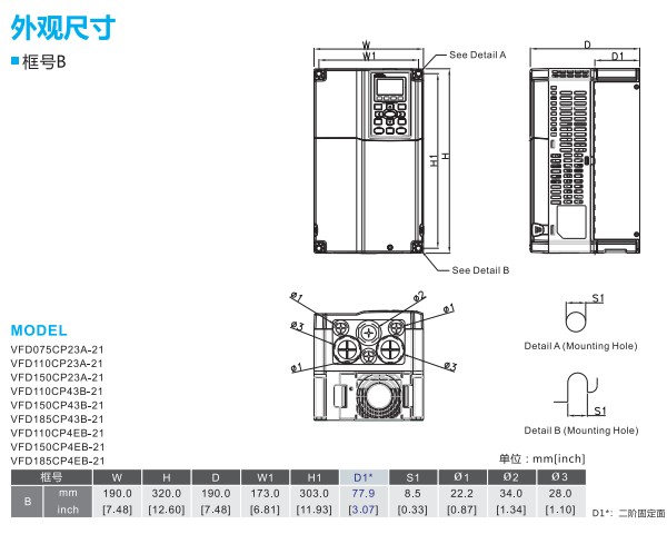 | VFD-CP | VFD750CP43B-21 | 380V/3P,75kW,内置10k PLC,刹车选购,DC电抗内建, UL,CE,IP20,NEMA1 |
