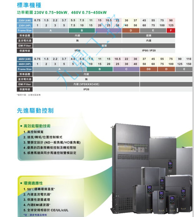 | VFD-CH | VFD900CH43A-00 | 380V/3P,90kW,内置10k PLC,刹车选购,DC电抗内建, UL,CE,IP00,UL OPEN TYPE |