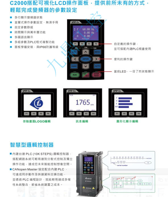 | VFD-CH | VFD015CH23A-21 | 220V/3P,1.5kW,内置10k PLC,刹车内建,DC电抗选购, UL,CE,IP20,NEMA1 |