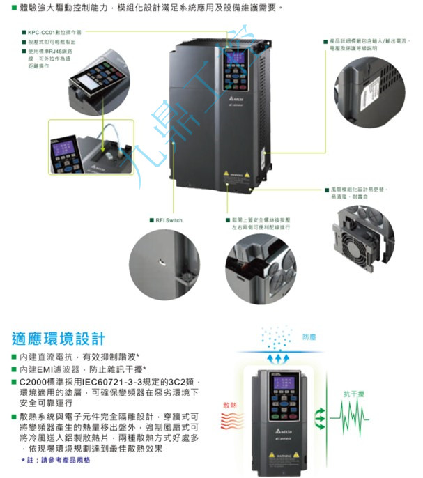 | VFD-CH | VFD220CH23A-00 | 220V/3P,22kW,内置10k PLC,刹车选购,DC电抗内建, UL,CE,IP00,UL OPEN TYPE |